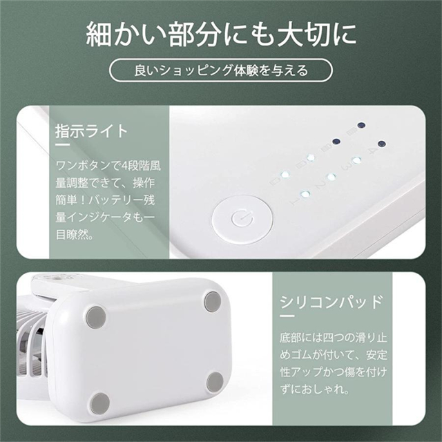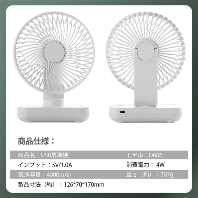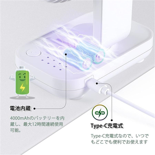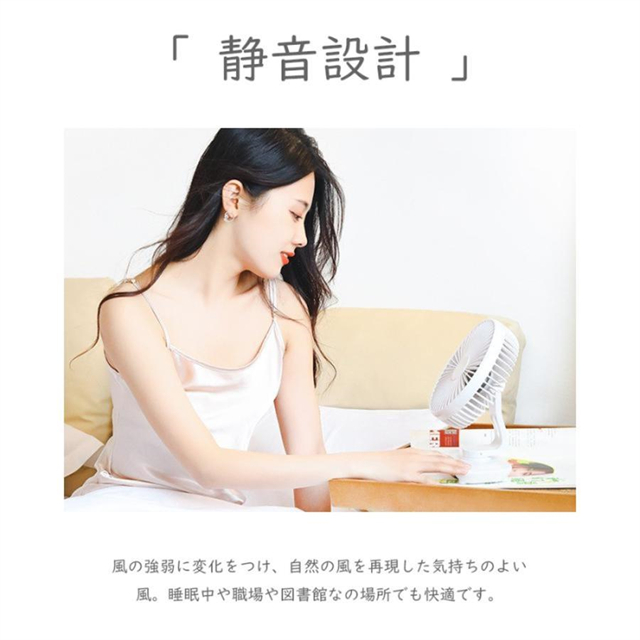 4000mAh大容量の内蔵型電池を採用し、フル充電の場合、最小モードで約16時間の連続使用ができます。最大モードでも約4時間の連続使用が可能です。書斎やオフィスの机の上など、ちょっとしたスペースでの使用に最適です。卓上扇風機本体には、優れた素材のABS樹脂を採用し、衝撃や高温に強く、耐久性が抜群です。