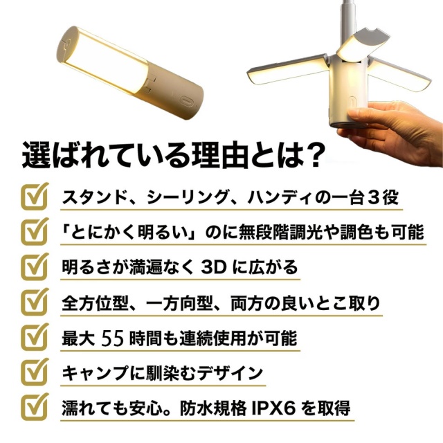 明るいだけじゃない」柔らかい光が3Dに広がるLEDランタン / スタンド、吊り下げ、ハンディ一台3役 / 55時間連続点灯 /