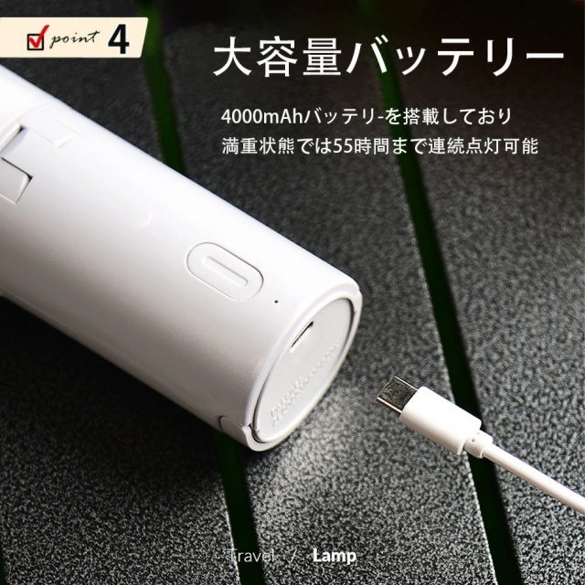4000mah の大容量バッテリーを内蔵し、最大55時間の連続点灯が可能。充電時間はわずか2~3時間で、緊急時に携帯電話を充電することができます。