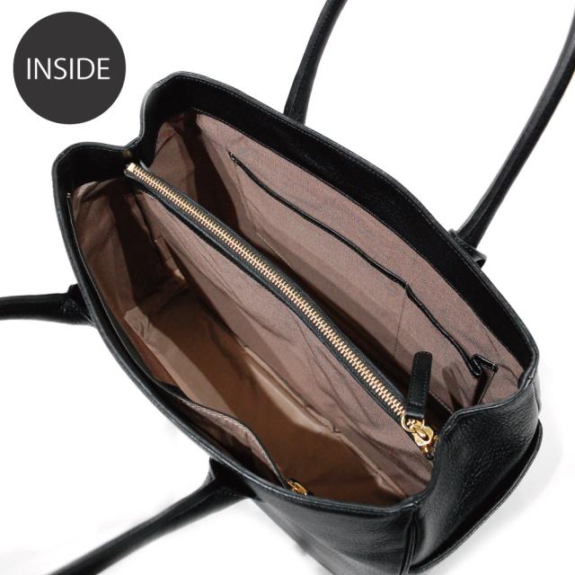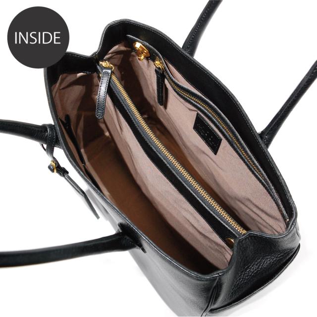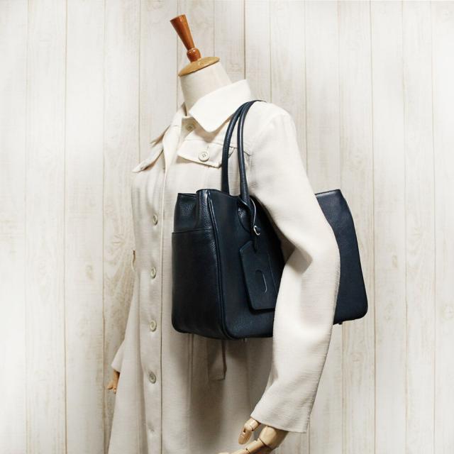 その上品なツヤ感を持つオリーブレザーの特徴を最大限に活かすよう、無駄な装飾を廃したシンプルなデザインのトートバッグです。