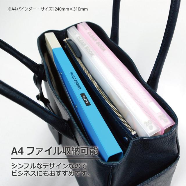バッグの横幅は標準的なA4サイズのクリアファイルやバインダーがちょうど収まるサイズです。
