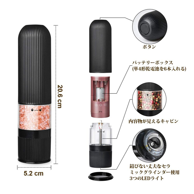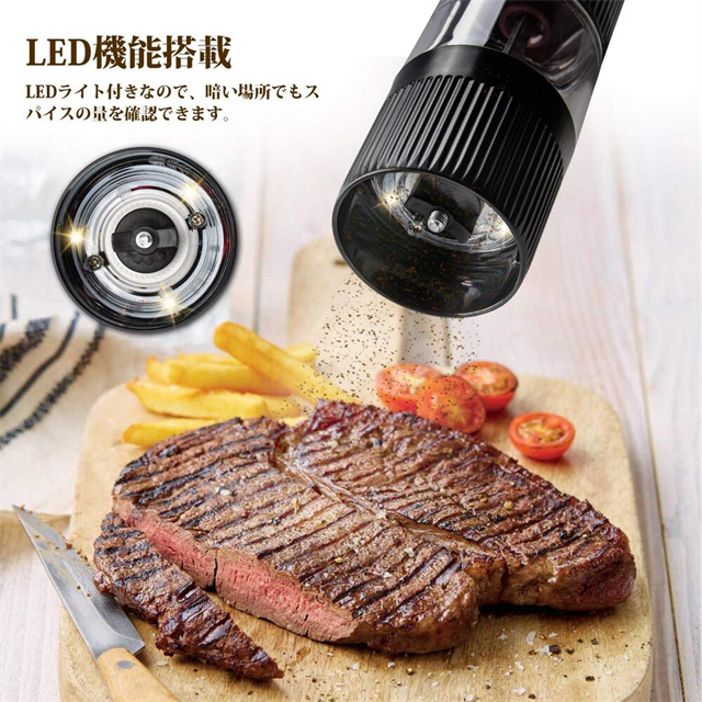 【LED機能搭載】電動ペッパーミルを使う際に、LEDライトが点灯します。手もとを明るく照らしてくれるので分量が見やすく、暗いキッチンでも便利に使えます。きれいでエレガントに見えるので、キッチンに置くだけでインテリアとしても楽しめます!また、キャビンは透明なので、残量が一目でわかります。