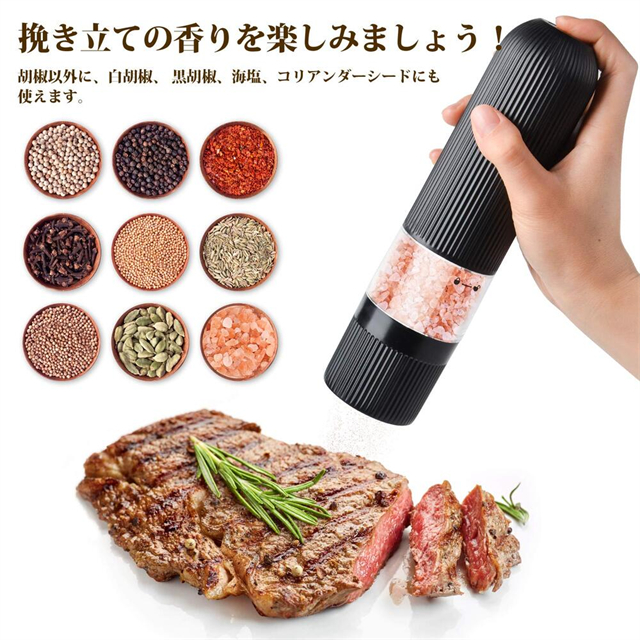 電動ミル ペッパー ソルトミル 電動マルチミル 黒コショウ 岩塩 塩 片手で挽ける 胡椒 ミル 電動 ブラックペッパー 塩挽き 岩塩ミル 調味料 キッチン家電 片手 調理器具 電池 便利 おしゃれ おすすめ 新生活 セラミック刃 粗さ調整 ライト付き