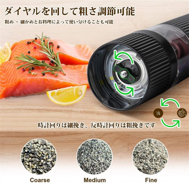 【粗さ調節機能】電動ミルの粗さは下部の真ん中にあるダイヤルで無段階に調節可能で、お好みの粒の大きさに変えることができます。調理中の味付けには「細挽き」、サラダや肉料理などの仕上げには「粗挽き」というように使い分けることができます。商品によって粗さの段階は異なるので、実際の用途に応じて選ぶことをおすすめします。
