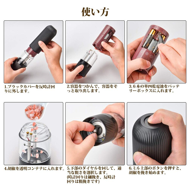 【ボタンを片手で押すだけで】単四電池を6本セットし、上部にあるボタンを押すだけで作動するので、片手でスパイスを手軽に素早く挽くことが出来る電動ミルです。簡単なワンタッチ操作で、押している間だけ作動するため、好みに合わせた量を挽くことができます。片手で操作できるから、食材を混ぜたり、炒めたりする手を休めずに使用することができます。ソルトとペッパーどちらにも使用でき、サラダ・スープの味付け、肉料理の下ごしらえにも最適。