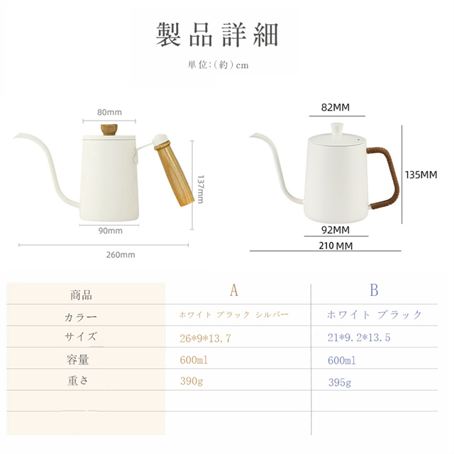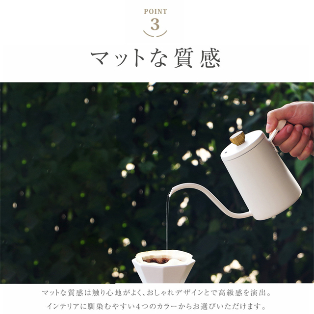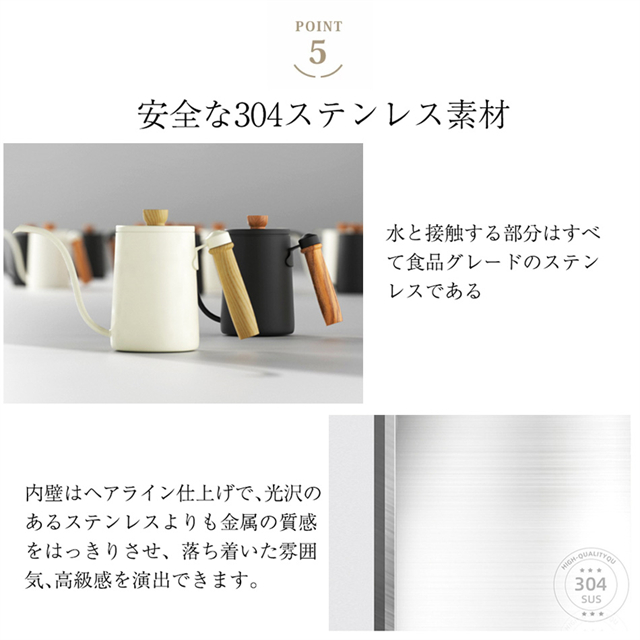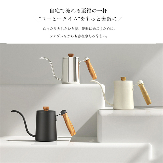 こだわりの質感と高級感が溢れ、ステンレス鋼製なのは防錆性と耐久性がよいだけでなく、お湯が適温に下がるので、ハンドドリップに最適です。