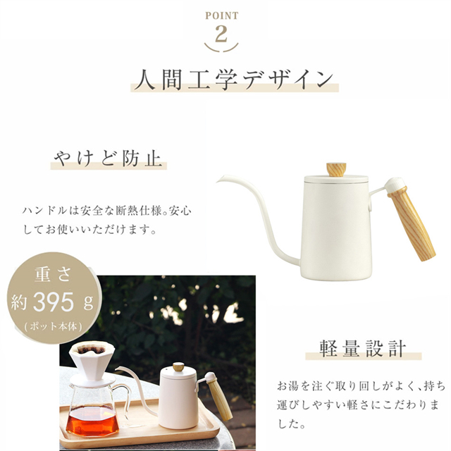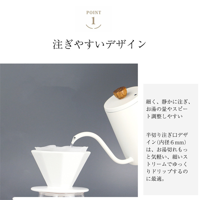 極細パイプの注ぎ口と女性でも持ちやすい取っ手は、ストレスなく湯量をコントロールしながら注ぐことができます。