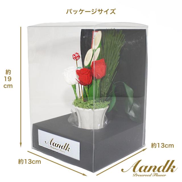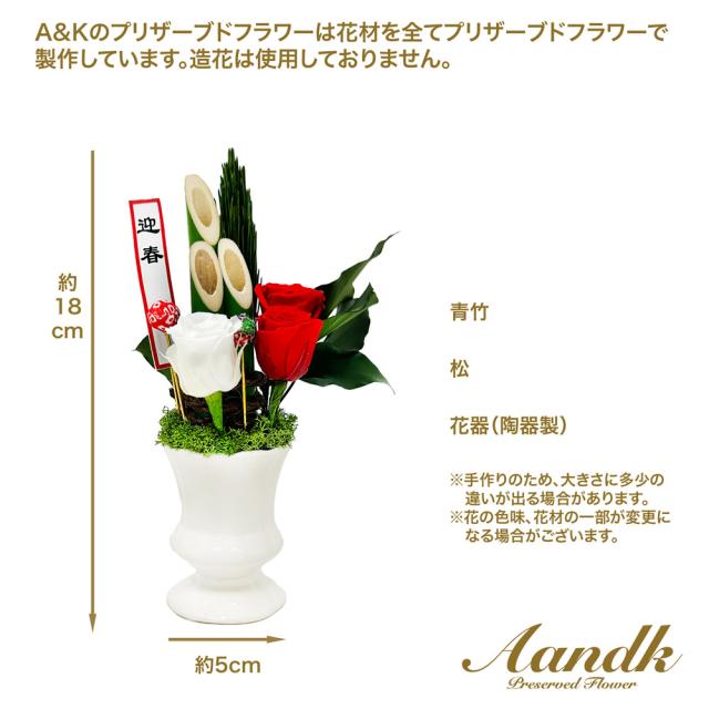| セット内容 | プリザーブド花材(松、竹、バラ、アイビー、モス)花器(陶器製)、ピック |