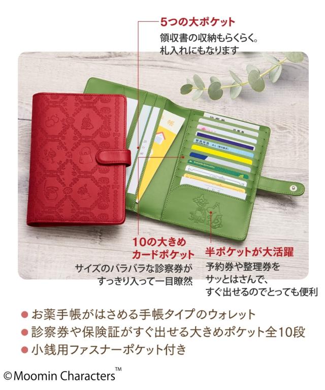 ムーミン谷の仲間たちが浮かび上がる、本革仕立て お薬手帳・お金・診察券がこれひとつに。 病院でも薬局でも受付スイスイ、会計らくらく。 明るいビタミンカラーの牛革に型押しされたリトルミイやスナフキンに、ホッとなごむ手帳タイプのウォレットです。 (c)Moomin Characters TM 発売元:インペリアル・エンタープライズ株式会社