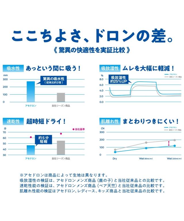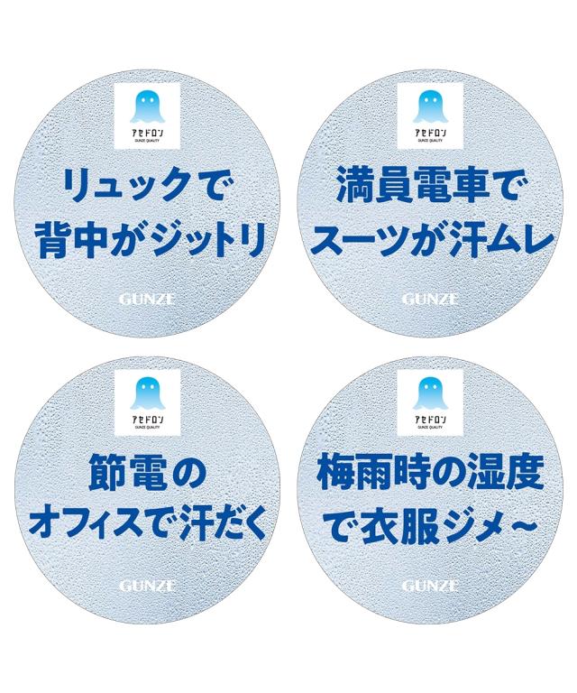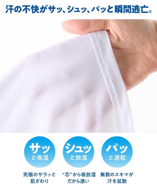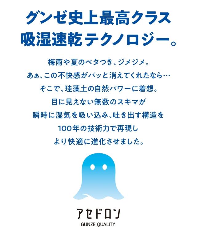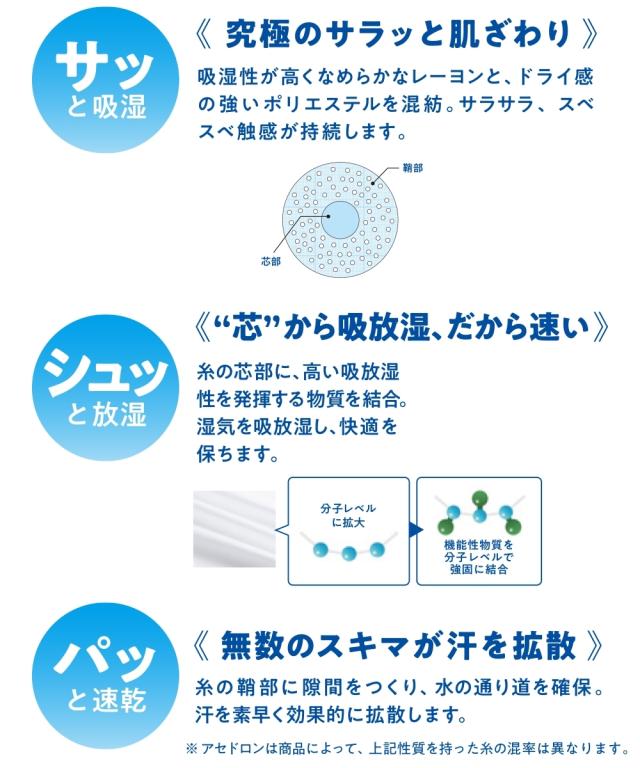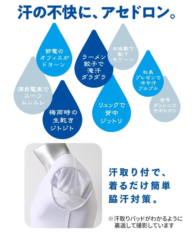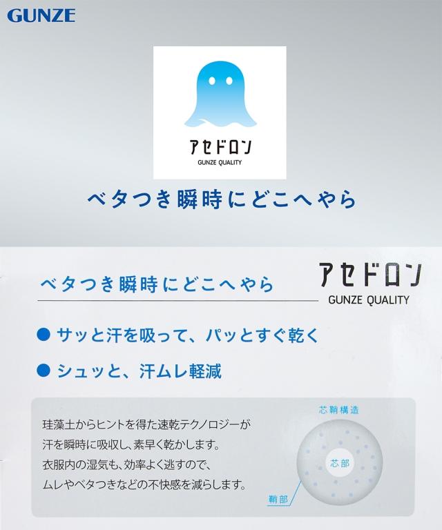 【アセドロン 汗取り付パッド付Tシャツインナー】 「ベタつき瞬時に どこへやら」 グンゼ史上最高クラス 吸湿速乾インナーのアセドロンです。 汗の不快が サッ、シュッ、パッ と瞬間逃亡。 珪藻土の自然パワーに着目した、吸湿速乾テクノロジー。■サッと吸湿 究極のサラッと肌ざわり なめらかなレーヨンとドライ感の強いポリエステルで、 サラサラ・スベスベ触感が持続します。 ■シュッと放湿 芯から吸放湿、だから速い 糸の芯部に、高い吸放湿性を発揮する物質を結合。 湿気を放出して快適を保ちます。 ■パッと速乾 無数のスキマが汗を拡散≫糸の中にスキマをつくり、水の通り道を確保。 汗を効果的に拡散します。 「ここちよさ、ドロンの差。」 吸水性・吸放湿性・速乾性・肌離れ性の 4つの快適性を実証比較。 暑い季節に求める機能が備わった、究極のインナーです。 他にもうれしいポイント●汗取り付 着るだけ簡単脇汗対策。 汗の不快に、アセドロン。