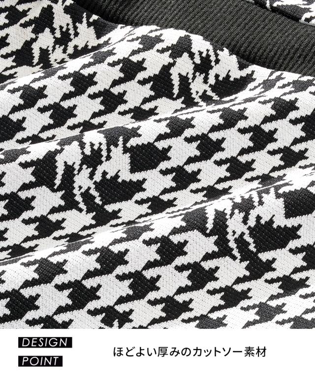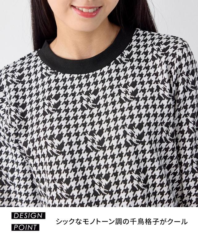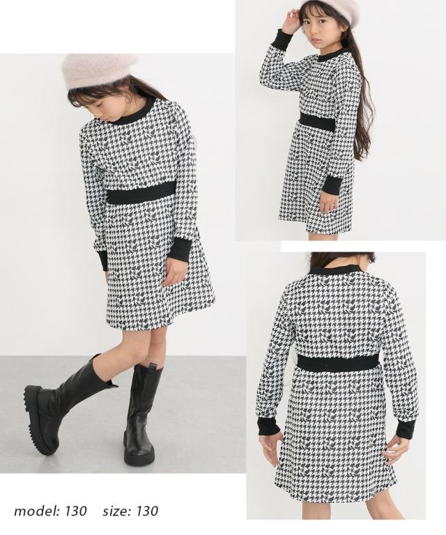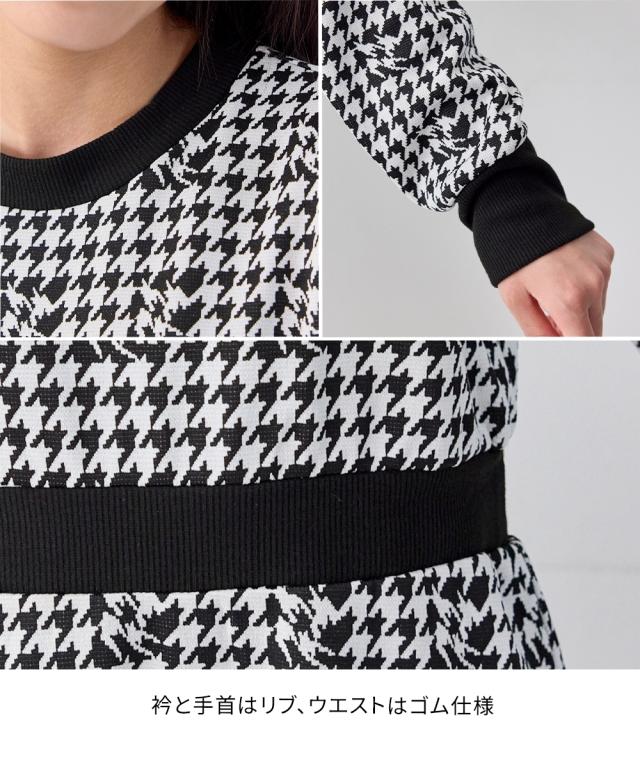 大人かわいいワンピース シックなモノトーン調の千鳥格子がクール。 ■デザイン ・衿・袖口・ウエスト部の配色がアクセントに ・モノトーン調の千鳥格子がポイント ・シンプルなシルエットですっきり見え ■素材 ・ほどよい厚みのカットソー素材