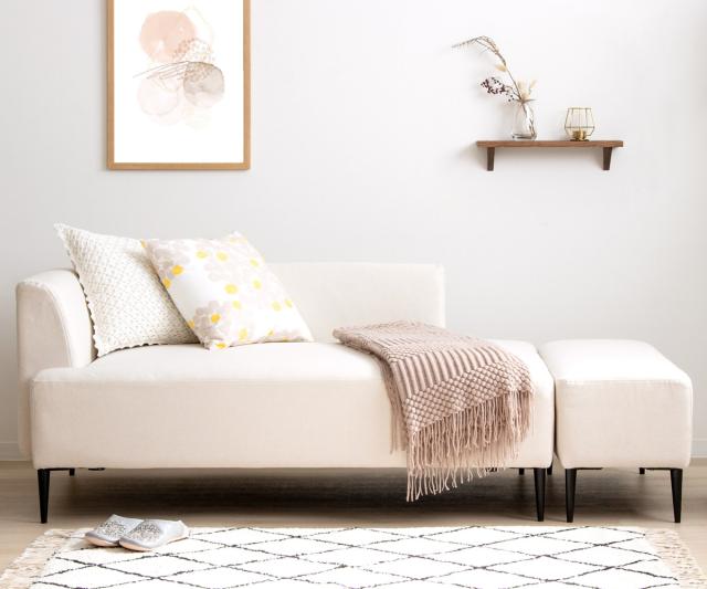 ワンルームソファと相性抜群のオットマンがセットになっています。くっつけたり、離したり、置き方次第で色々な使い方ができます。