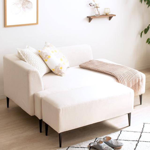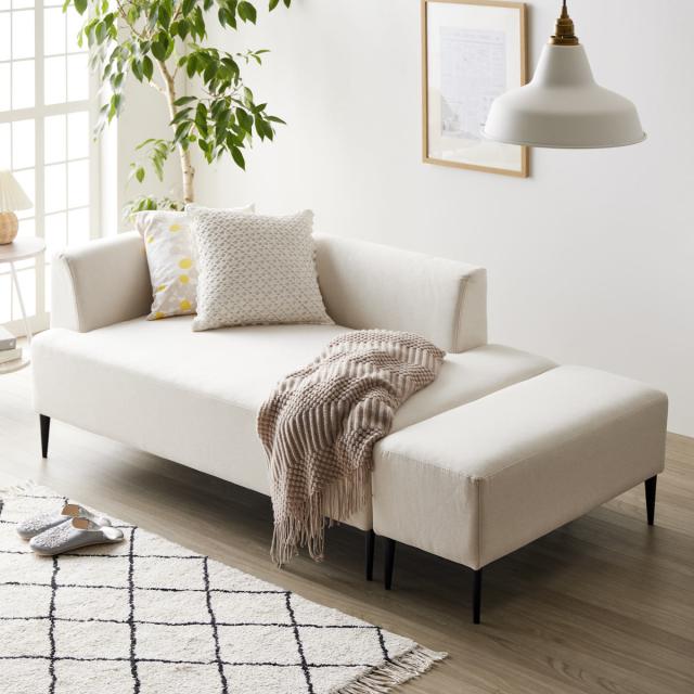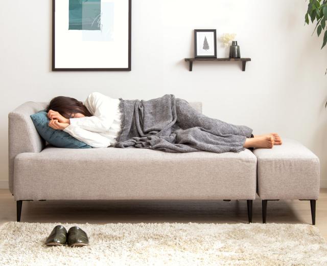 ソファとオットマンを横に並べて置くと、横になってお昼寝もできるベッドスタイルになります。