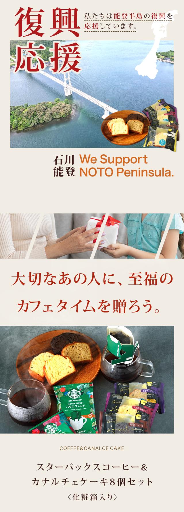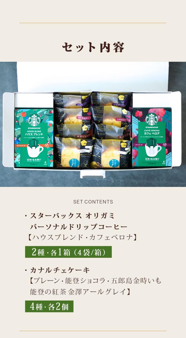 ・スターバックスオリガミパーソナルドリップコーヒー【ハウスブレンド・カフェベロナ】×各1箱(各9g×4袋)、カナルチェプレーンケーキ×2個、カナルチェ五郎島金時いもケーキ×2個、カナルチェ能登の紅茶金澤アールグレイケーキ×2個、カナルチェ能登ショコラケーキ×2個