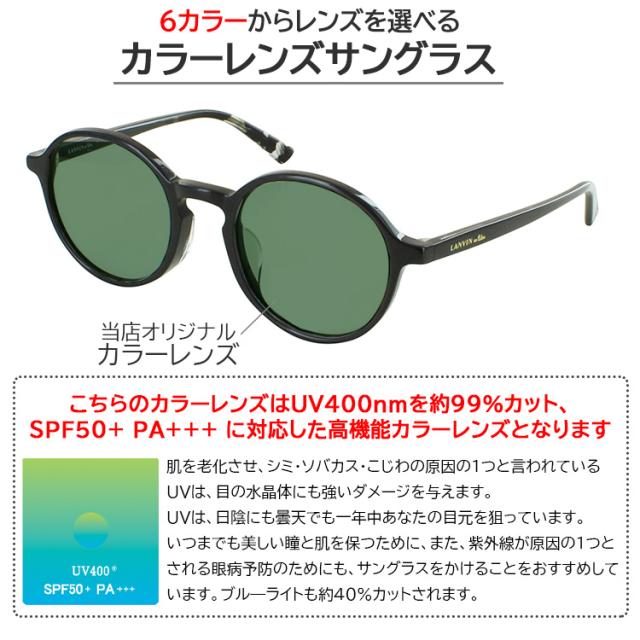 | 商品詳細 ランバンオンブルー メガネフレームに、 当店オリジナルカラーレンズを組み合わせた、サングラス レディースモデル ・大きめラウンドシェイプのアセテートモデル ・フロントは定番のBlackに加え、肌なじみの良いクリアカラーをラインナップ ・デザイン性の高いキーホールブリッジ ・グラデーションやカラーで魅せる様々なパターンを組み合わせたファッショナブルなテンプル ・全体の表面を直線的にすることでモードな雰囲気に ・テンプルには3D PrintingでLANVIN en Bleuロゴを配し、しのみ先の切り欠きはJLロゴを表現 こちらのカラーレンズはUV400nmを約99%カット、 SPF50+ PA+++に対応した高性能カラーレンズとなります レンズカラーは6色の中からお選びいただけます。 <レンズカラー:可視光線透過率 > 1.グレー:13% 2.スモーク:13% 3.ブルースモーク:16% 4.グリーン:16% 5.グリーンスモーク:13% 6.ブラウン:11% | |