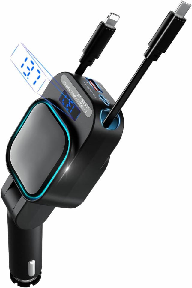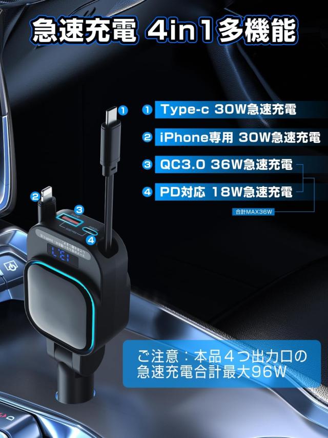 【高出力の急速充電 96W Max】 本 usb シガーソケットは、Type-C PD ポート:36W Max、USB-A QC3.0 ポート:18W Max、伸縮Type-Cケーブル:30W Max、伸縮ライティングケーブル:30W Max、合計最大96Wの出力、FCP、AFC、QC2.0、QC3.0、PD3.0、PPS などのクイックチャージに対応し、高速充電できる車 充電器です。ご注意:急速充電は急速充電対応できる機器と充電ケーブルが必要です。