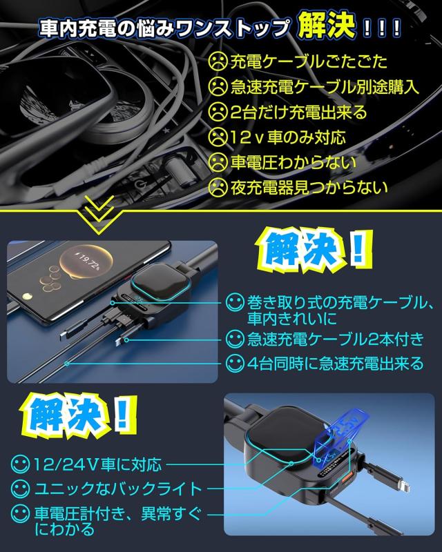 【4in1 4台同時に充電 】 このシガーソケットはPD Type-Cポート+QC3.0 USB-A ポート+2*巻取り式ケーブル付き、4台のデバイスを同時に充電でき、出張仕事、自分の運転、家族・グループ旅行など、多様なシーンで大活躍!