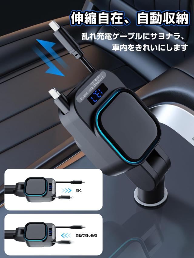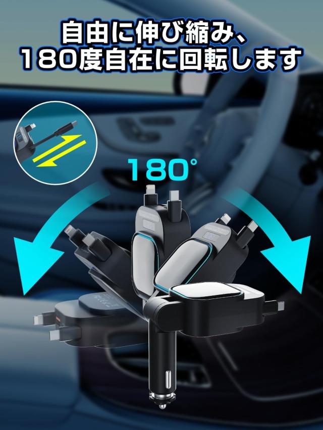 【保存しやすい車 充電器】 巻き取り式の充電ケーブルで、絡まることなく、車の散らかりにさようなら!急速充電 シガーソケットのケーブルは65cmまで簡単に伸ばすことができ、前後座席両方の方とも快適に充電できます。シガーソケットの頭部は車に簡単に接続できるように自由に180°角度調節できます。