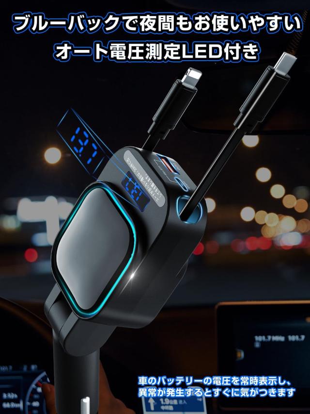 シガーソケット usb-c 車 充電器 急速充電 カーチャージャー タイプc PD3.0 急速充電 QC3.0 USB-A 4台同時に充電 最大96W 巻き取り式充電ケーブル バックライト オート電圧測定LED付き 車12〜24V汎用 スマホ タブレット iPhone/iPad/Android各種類対応