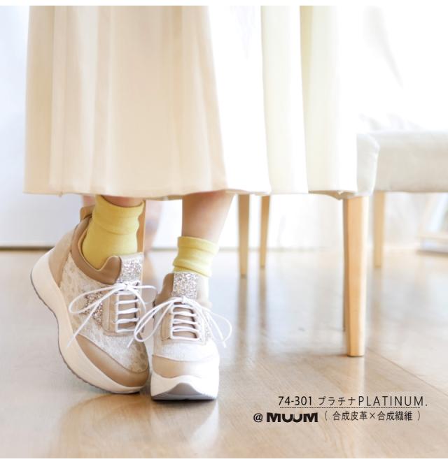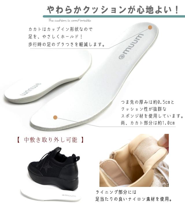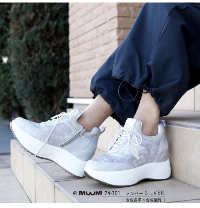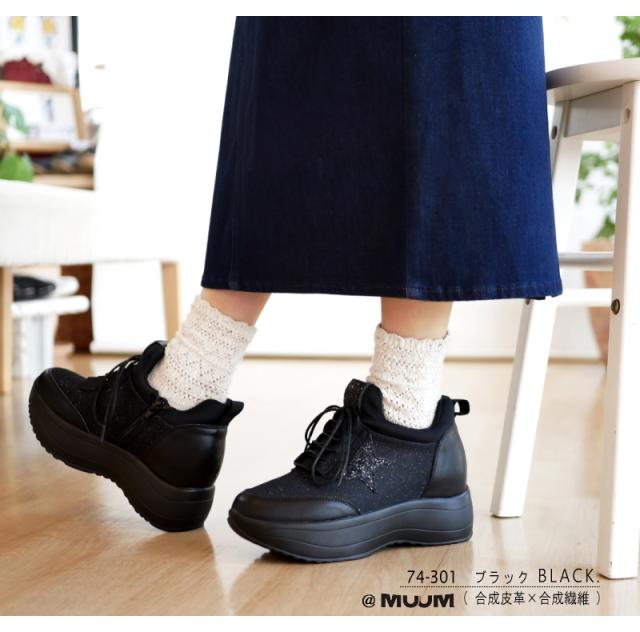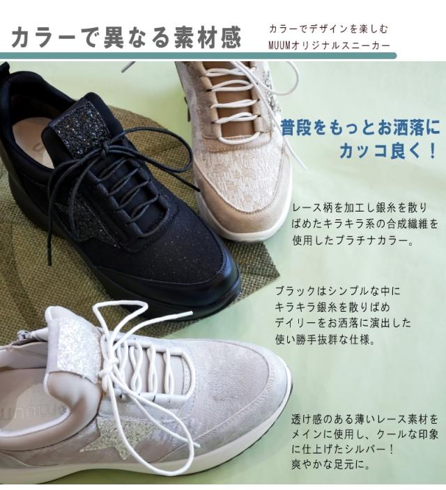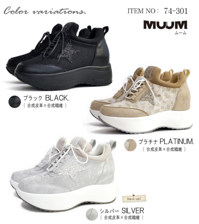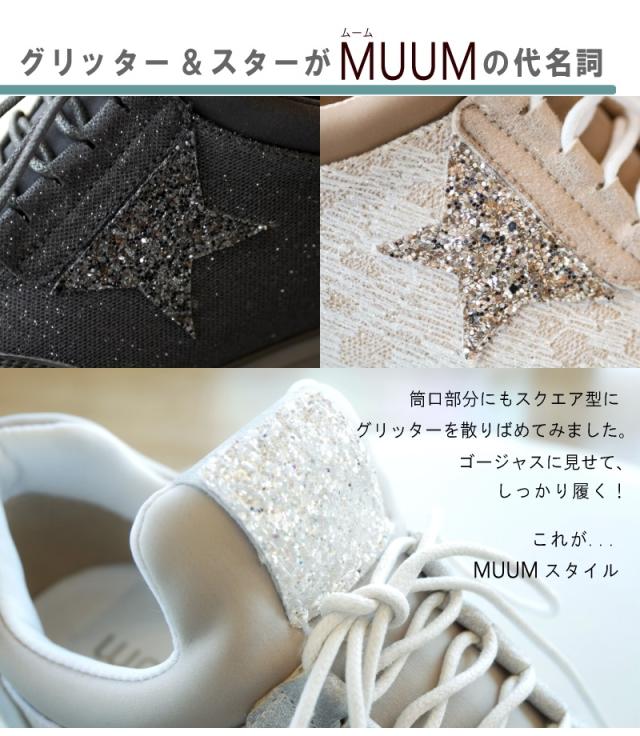 MUUM ムーム スニーカー レディース 星 グリッター インヒール 厚底 ボリュームソール プラットフォーム レースアップ ファスナー 黒 プラチナ クール お洒落 脚長 韓国 原宿 ゴスロリ 3e