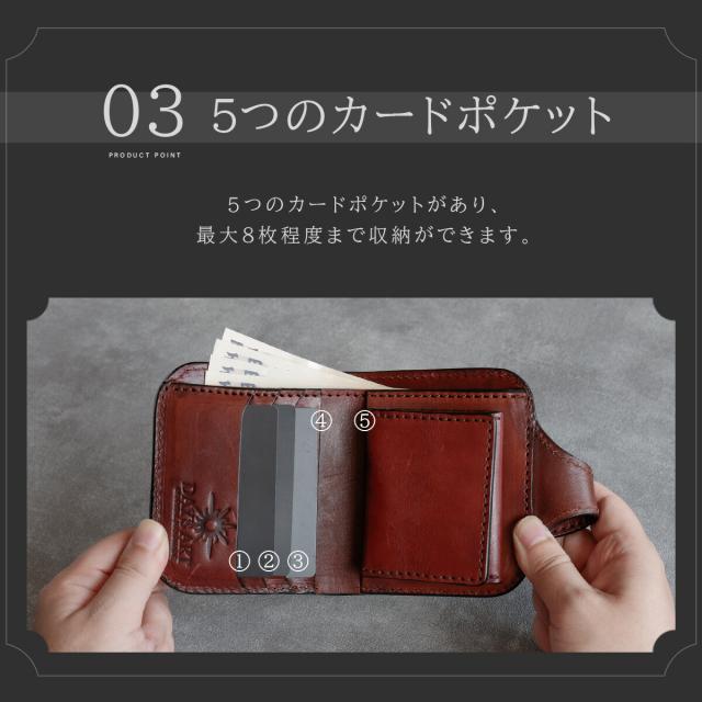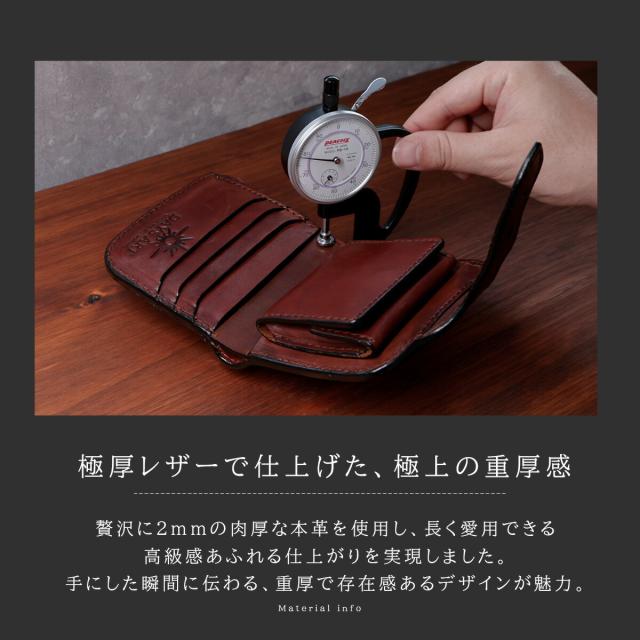 1.8mmの肉厚な牛革が醸し出す重厚感と、熟練の革職人によるハンドメイドの仕上げが特徴です。細部にまでこだわり抜かれた職人技が、長く使える丈夫で洗練された一品を作り上げています。