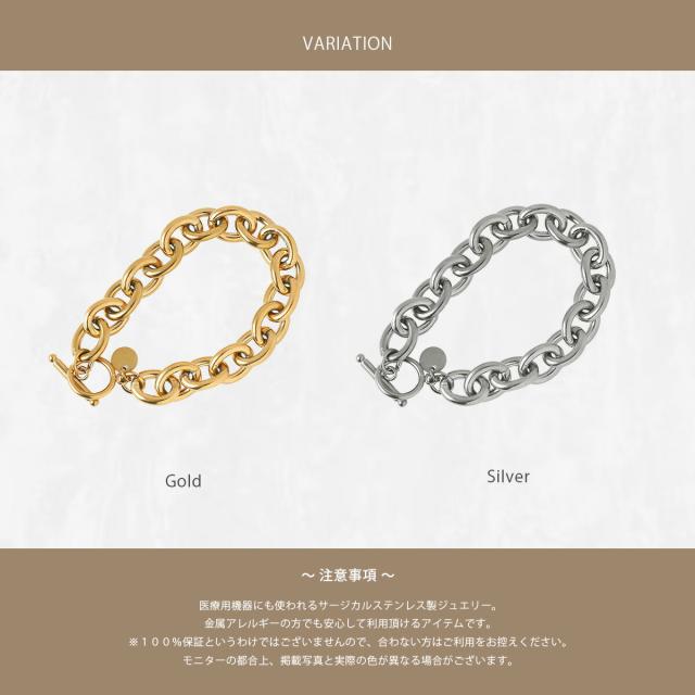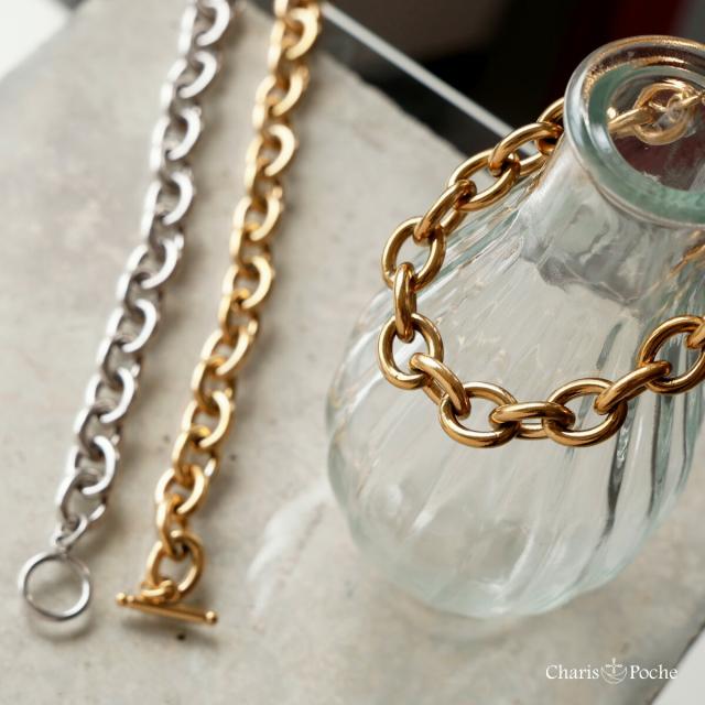 シンプルな装いにアクセントを加える、存在感のあるチェーンブレスレット。ゴールドとシルバーのカラー展開で、スタイルに合わせて選べる洗練されたデザイン。ボリューム感がありながらも軽やかで、華やかな印象を与えます。季節を問わず、どんなシーンにも合わせやすいのが魅力です。サージカルステンレスを使用しており、金属アレルギーにも配慮した設計です。腕時計や他のジュエリーと重ね付けしてもバランスよく馴染み、さりげないおしゃれを演出します。