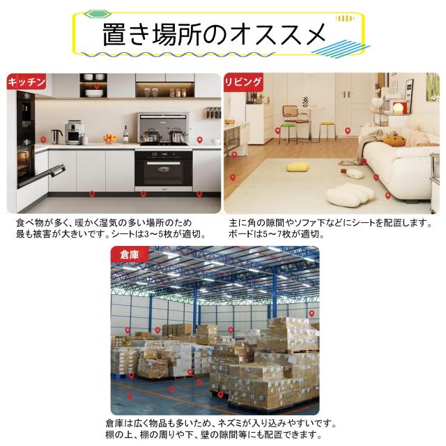 適用範囲:キッチン リビング 浴室 天井裏 隙間 床下 地下室 食品工場 倉庫 ホテル その他ネズミが出入りする場所等