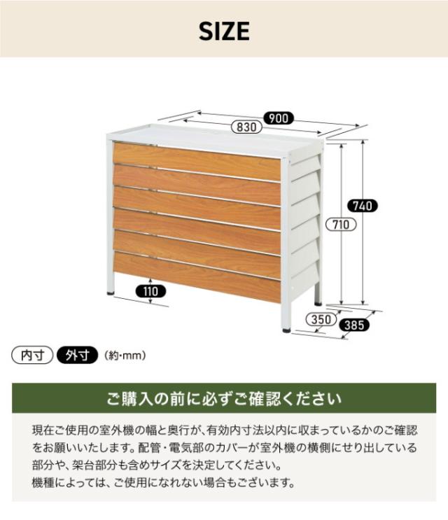 外寸:(約)幅900×奥行385×高さ740mm 内寸:(約)幅830×奥行350×高さ710mm 重量:(約)6.35kg ※現在ご使用の室外機の幅と奥行きが有効内寸以内に収まっているかのご確認をお願いいたします。 配管・電気部のカバーが室外機の横側にせり出している部分や、架台部分も含めサイズを決定してください。 機種によっては、ご使用になれない場合もございます。 |