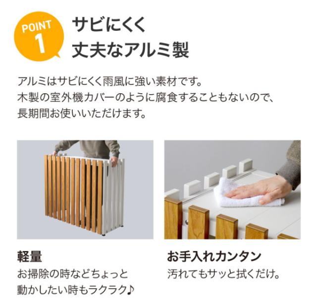 室外機カバーですっきりオシャレに! 直射日光を遮り、室外機の温度上昇を抑制、省エネにも効果的! サビにくく丈夫なアルミ製。 木製の室外機カバーのように腐食することもないので、長期間お使いいただけます。 軽量なのでお掃除の時などちょっと動かしたい時もラクラク。 汚れてもサッと拭くだけ。お手入れカンタン! ナチュラルな木目調のルーバーとツートンカラーが今時のスタイリッシュなお家によく馴染みます。 耐荷重10kgなので安心して上に物を載せることができます。 ガタツキ防止のアジャスター付き。 ■その他の室外機カバーはこちら↓ 室外機カバー |