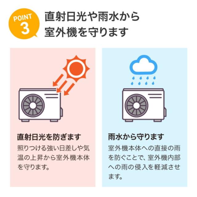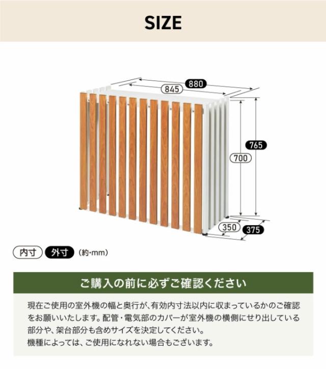 外寸:(約)幅880×奥行375×高さ765mm 内寸:(約)幅845×奥行350×高さ700mm 重量:(約)7.2kg ※現在ご使用の室外機の幅と奥行きが有効内寸以内に収まっているかのご確認をお願いいたします。 配管・電気部のカバーが室外機の横側にせり出している部分や、架台部分も含めサイズを決定してください。 機種によっては、ご使用になれない場合もございます。 |