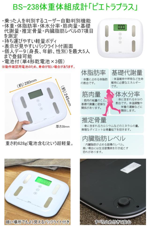 体重体組成計 ピエトラプラス BS-238 ドリテック ボディスケール 測る 計測 測定 シンプル 体重 体脂肪率 体水分率 筋肉量 推定骨量 基礎代謝量 内蔵脂肪レベル 簡単 便利 自動電源 バックライト付 オシャレ 送料無料