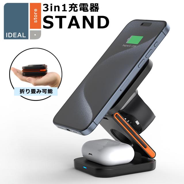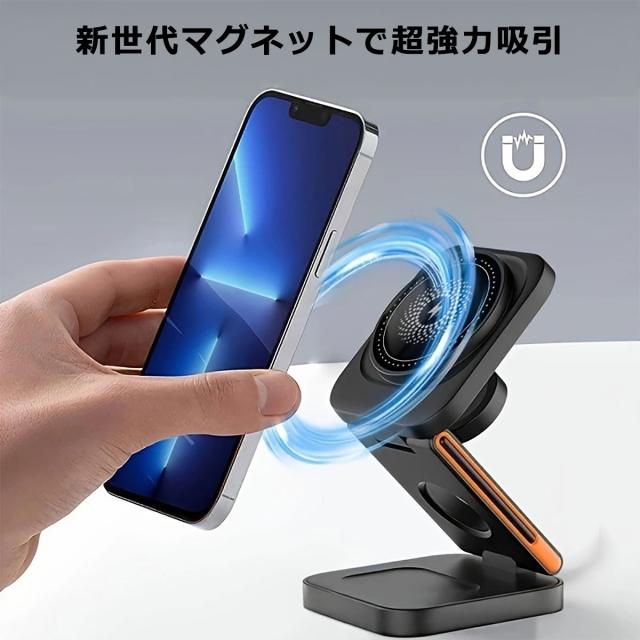 ワイヤレス充電器 3in1 マグネット magsafe 折り畳み 15W iphone android Qi 急速充電 充電器 スマホスタンド AppleWatch AirPods 置くだけ コンパクト 持ち運び 3台同時充電 高さ ワイヤレスチャージャー 充電スタンド ワイヤレス充電器iphone