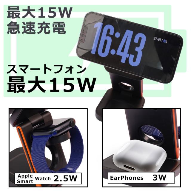 3台同時充電対応:iPhone、Apple Watch、AirPodsの同時充電が可能。