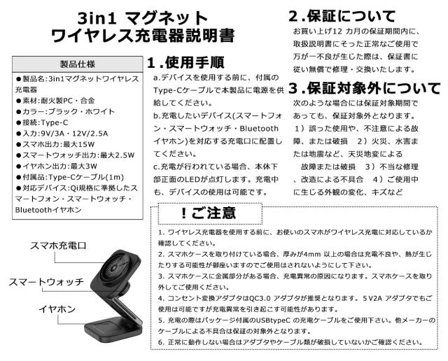 | 対応機種 | スマホ:iPhone等ワイヤレス充電対応スマートフォン スマートウォッチ:Apple Watch等ワイヤレス充電対応スマートウォッチ イヤホン:AirPods等ワイヤレス充電対応イヤホン ※すべてQi規格に準拠 |