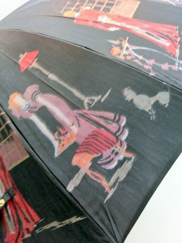 オリジナルのフレンチマダム柄の日本製晴雨兼用手開き傘です。きれいな富士山の湧水で染色したポリエステルとシルク糸を、ほぐし織りの特殊技法で丹精込めて織り上げました。