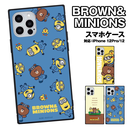 送料無料 BROWN&MINIONS iPhone12/12Pro対応スクエアガラスケース MINI-278 /集合 ソファ 総柄 ミニオンズ