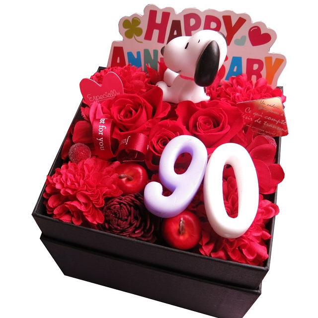 卒寿お祝い プレゼント 90歳 スヌーピー入り 数字90入り 花束風 枯れない 赤バラ 箱を開けてサプライズ ボックス入り プリザーブドフラワー ご希望数字でお作り致します スヌーピーマスコット種類はおまかせです