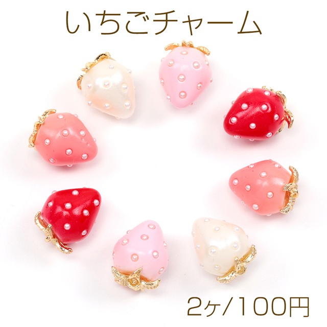 いちごチャーム 樹脂製 苺チャーム 立体イチゴチャーム 表面パール付き 合金ヘタあり 1カン付き 12×16mm(2ヶ)