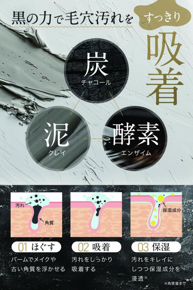 ◆ 「ブラックバームで毛穴汚れを徹底吸着」 毛穴汚れ、角栓、余分な皮脂などをしっかり落とすために研究開発をして誕生したクレンジングバームです。