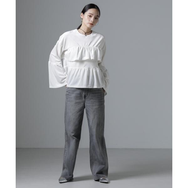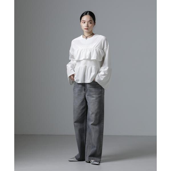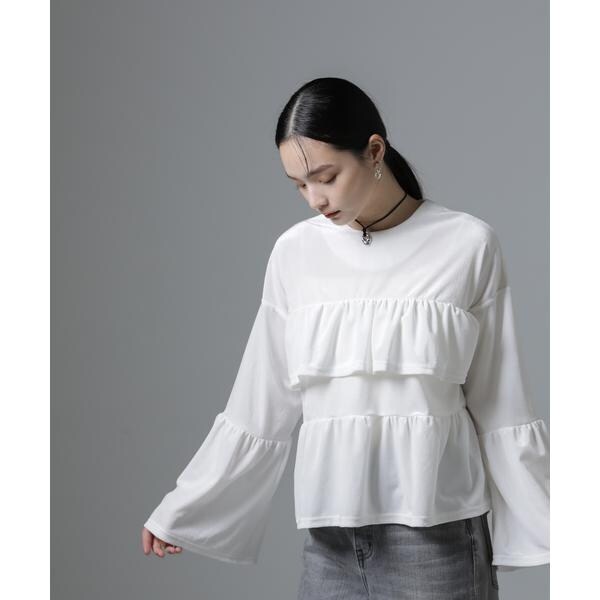 程良い甘さと上品な雰囲気漂うデザインのプルオーバブラウス。胸元とや袖に、たっぷりと寄せたフリルが、Aラインのシルエットを作り存在感ある一枚です。