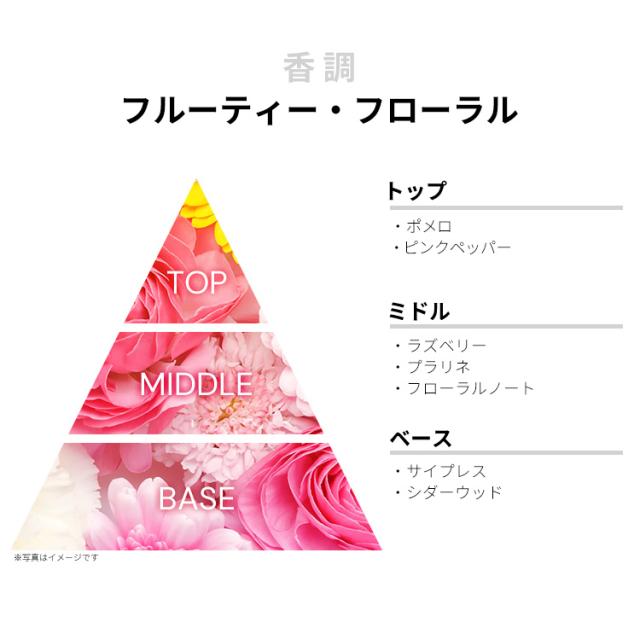 香りは、ポップなフルーティー・フローラルの香調がベース。カジュアル・キュートなアイテムにしあげられております。