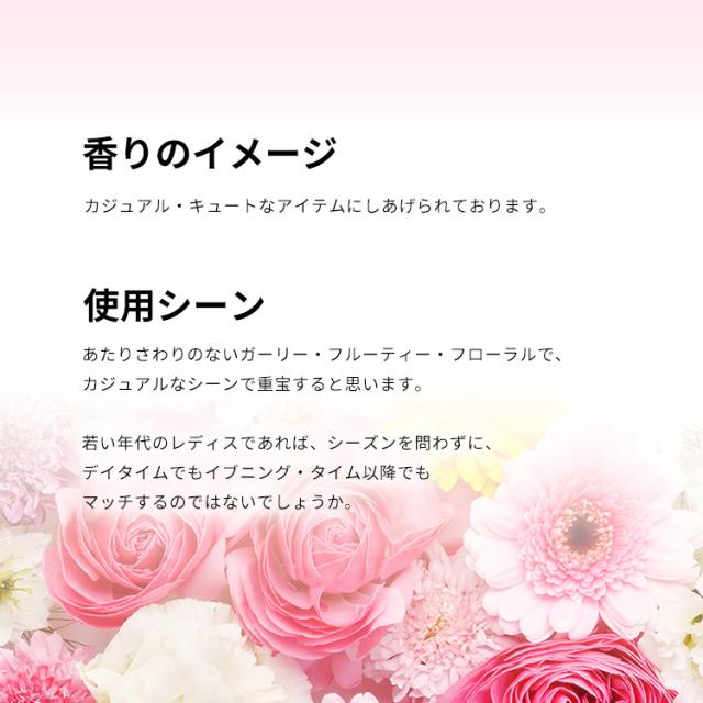 あたりさわりのないガーリー・フルーティー・フローラルで、カジュアルなシーンで重宝すると思います。