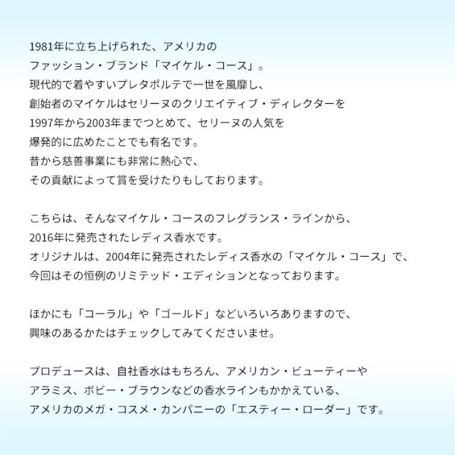 オリジナルは、2004年に発売されたレディス香水の「マイケル・コース」で、今回はその恒例のリミテッド・エディションとなっております。