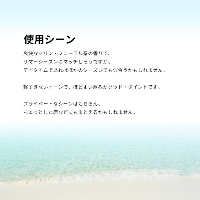 爽快なマリン・フローラル系の香りで、サマーシーズンにマッチしそうですが、デイタイムであればほかのシーズンでも似合うかもしれません。軽すぎないトーンで、ほどよい厚みがグッド・ポイントです。プライヴェートなシーンはもちろん、ちょっとした席などにもまとえるかもしれません。