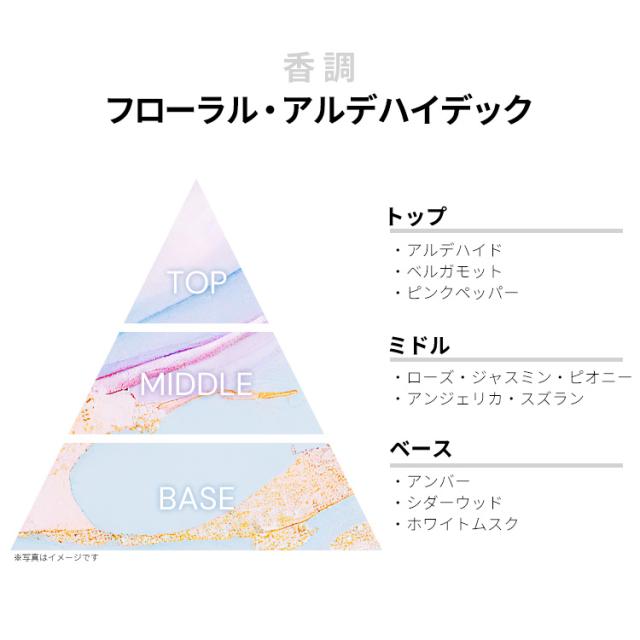 アルデハイド、ベルガモット、ピンクペッパーなどが、スタイリッシュで凛としたシトラス・スパイシーを香り立たせるトップから、
