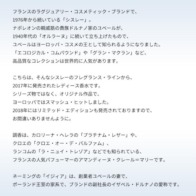 こちらは、そんなシスレーのフレグランス・ラインから、2017年に発売されたレディス香水です。シリーズ物ではなく、オリジナル作品で、ヨーロッパではスマッシュ・ヒットしました。2018年にはリミテッド・エディションも発売されておりますので、おまちがいありませんように。