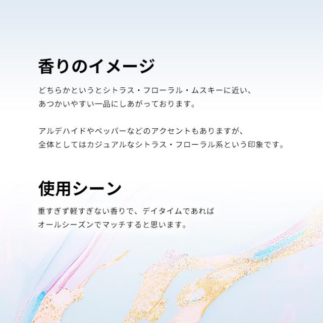 香りは、モダンなフローラル・アルデハイデックの香調がベース。どちらかというとシトラス・フローラル・ムスキーに近い、あつかいやすい一品にしあがっております。