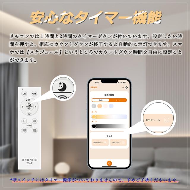 - 本製品にはタイマー機能が搭載されており、リモコンで1時間/2時間後に消灯することが設定できます。スマホアプリを使えば、設定したい時間を自由にタイマーを設定することができます。この機能は、お子様が定時に就寝する習慣を身につけるのに役立ち、より良い成長を促進します。また、大人にとっても、夜の時間を管理し、良い睡眠習慣を確立するのも役立ちます。