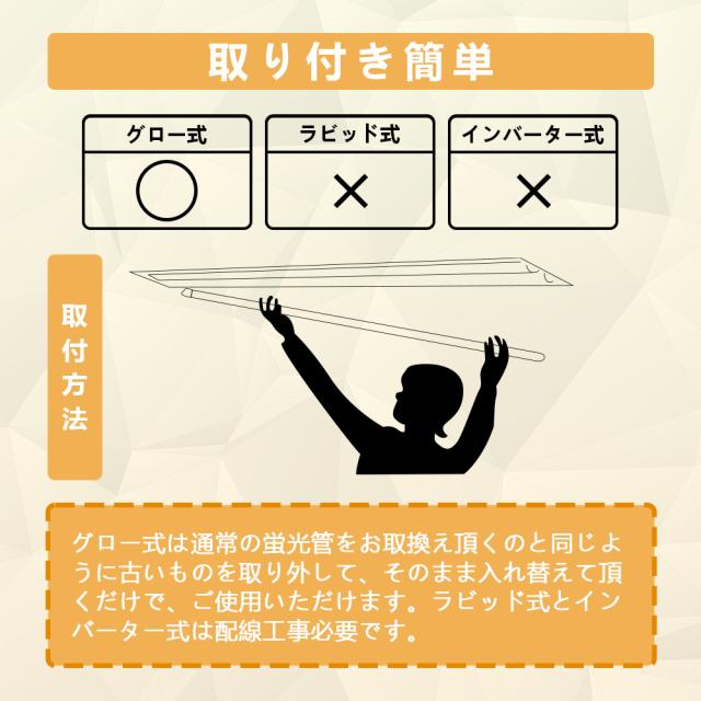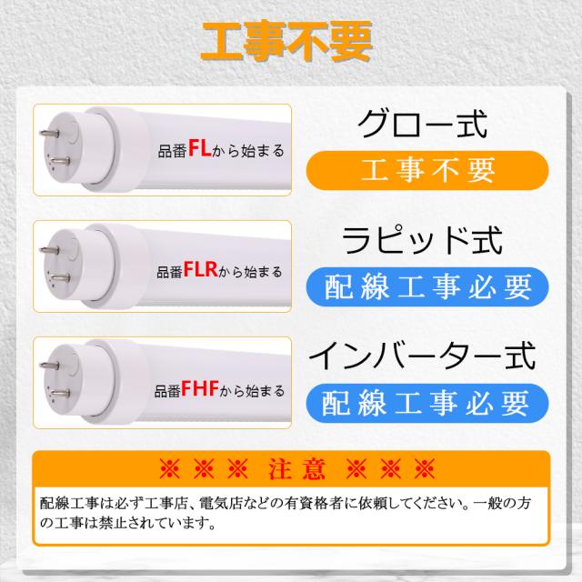 - 本製品はグロー式工事不要です。通常の蛍光管をお取換え頂くのと同じように古いものを取り外して、そのまま入れ替えて頂くだけで、ご使用いただけます。ラビッド式とインバーター式は配線工事必要です。(※配線工事は必ず工事店、電気店などの有資格者に依頼してください。一般の方の工事は禁止されています。)