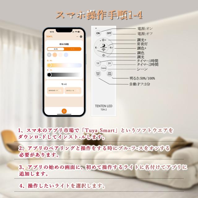 スイッチ:壁スイッチ、リモコン、アプリ(tuyaアプリ「Tuya smart/smart Life」を使って、モバイル端末を使用してLED電球の操作を行います。)